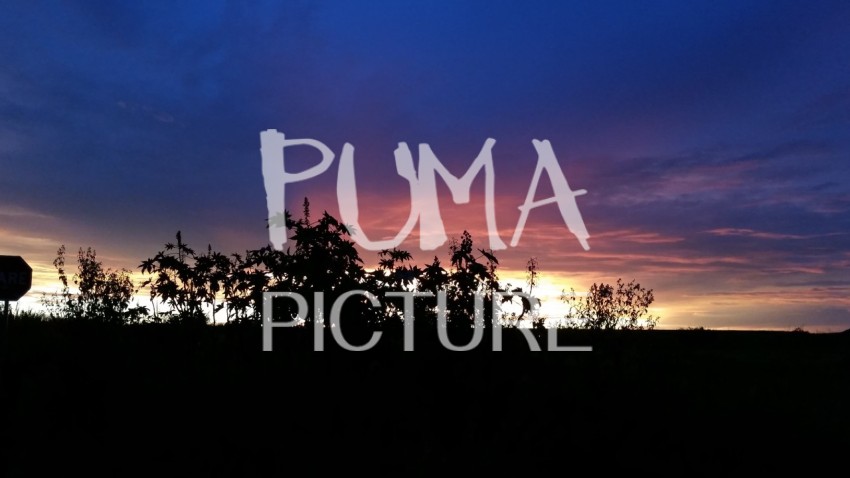 A purple, lilac, and pink sky sunset with silhouettes of castor bean plant (Ricinus communis) on the center and a traffic board silhouette at the left.