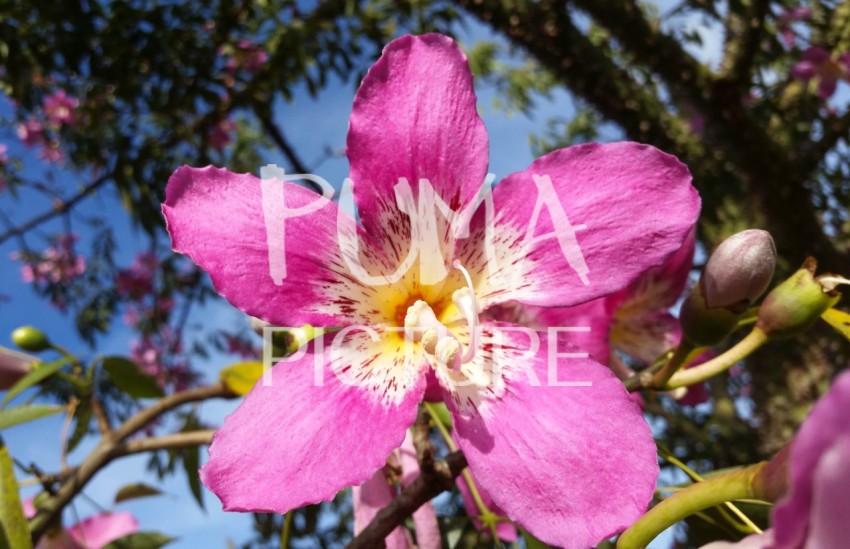 A Cordia superba Cham (Geiger Tree) flower, with a white crinkled petal texture and prominent yellow stamens, set against green leaves and buds.
